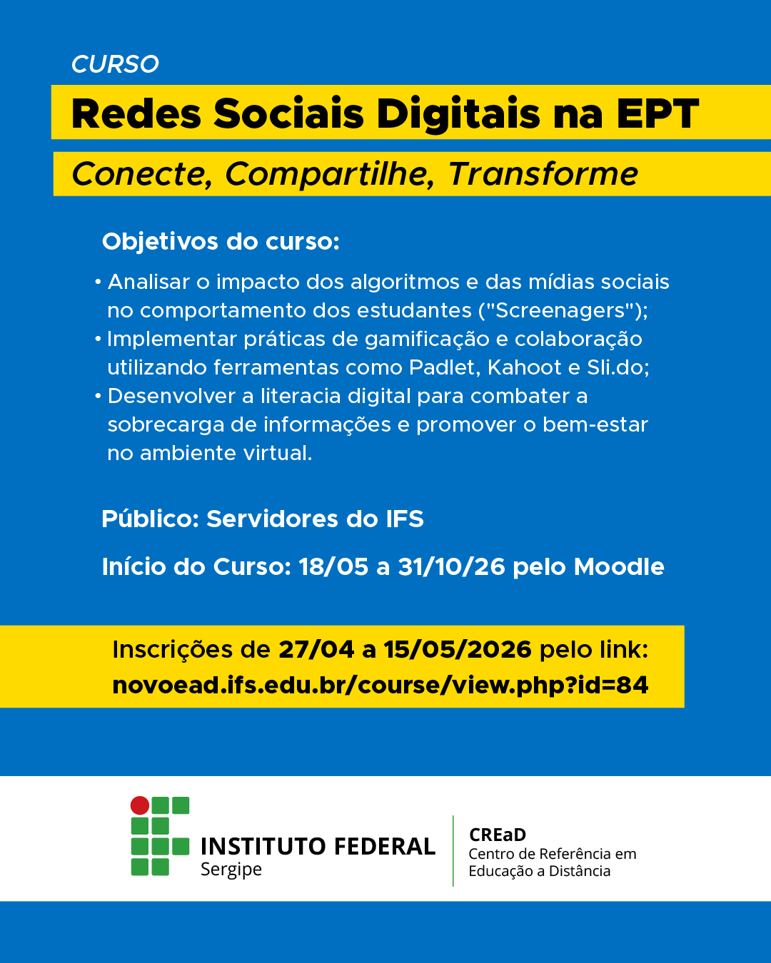 O evento é um convite da Pró-reitoria de Ensino à reflexão sobre os processos educacionais e de aprendizagem na instituição e é destinado aos profissionais envolvidos diretamente nessa área, entre eles docentes, técnicos em assuntos educacionais, pedagogos, assistentes sociais e psicólogos do IFS. Não perca!